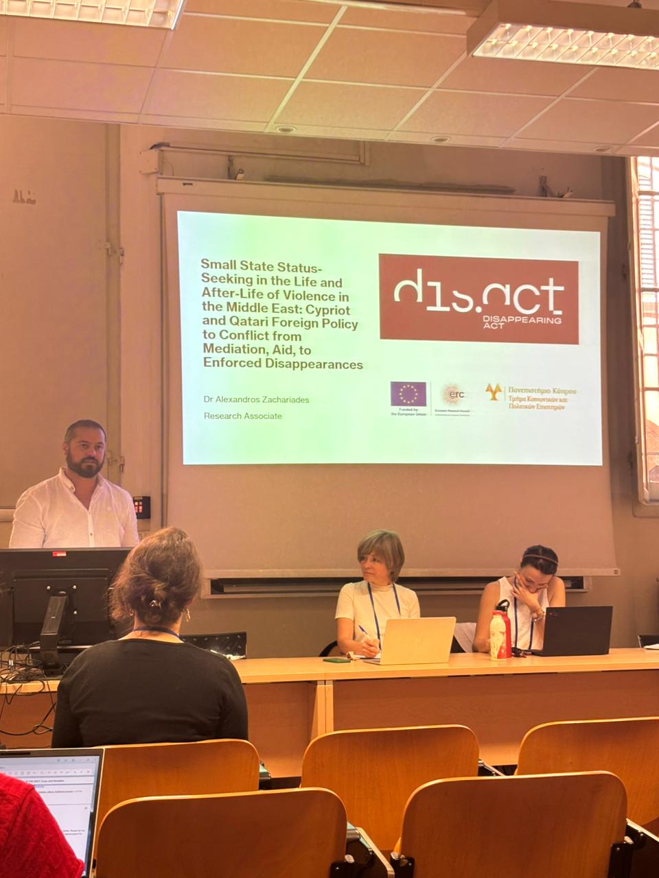 From 25 to 29 August 2025, DISACT team member Alexandros Zachariades participated in the EISA PEC 2025 conference, held at the University of Bologna. Alexandros presented a paper on small state status-building amid conflict in the Middle East, focusing on the foreign policy responses of Cyprus and Qatar to the war in Gaza. The paper examined how both states have sought to enhance their international status by positioning themselves as “useful” and “good” actors. Pertinent to the work of DISACT, the presentation highlighted Cyprus’s failure to leverage its expertise in investigating enforced disappearances as a diplomatic tool, despite the ongoing relevance of enforced disappearances in Syria and Lebanon. The conference provided an opportunity to share findings and receive constructive feedback.